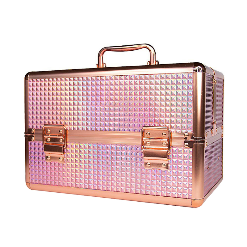 Snygg sminkväska i aluminium i roseguldig, klassisk design vadderad med mjukt tyg. Väskan är utrustad med två lås och har flera fack för till exempel smink, nagelvårdsprodukter, nagellampa eller elektrisk nagelfil. Den perfekta lösningen för skönhetsspecialister som arbetar på resande fot eller erbjuder kundbesök.