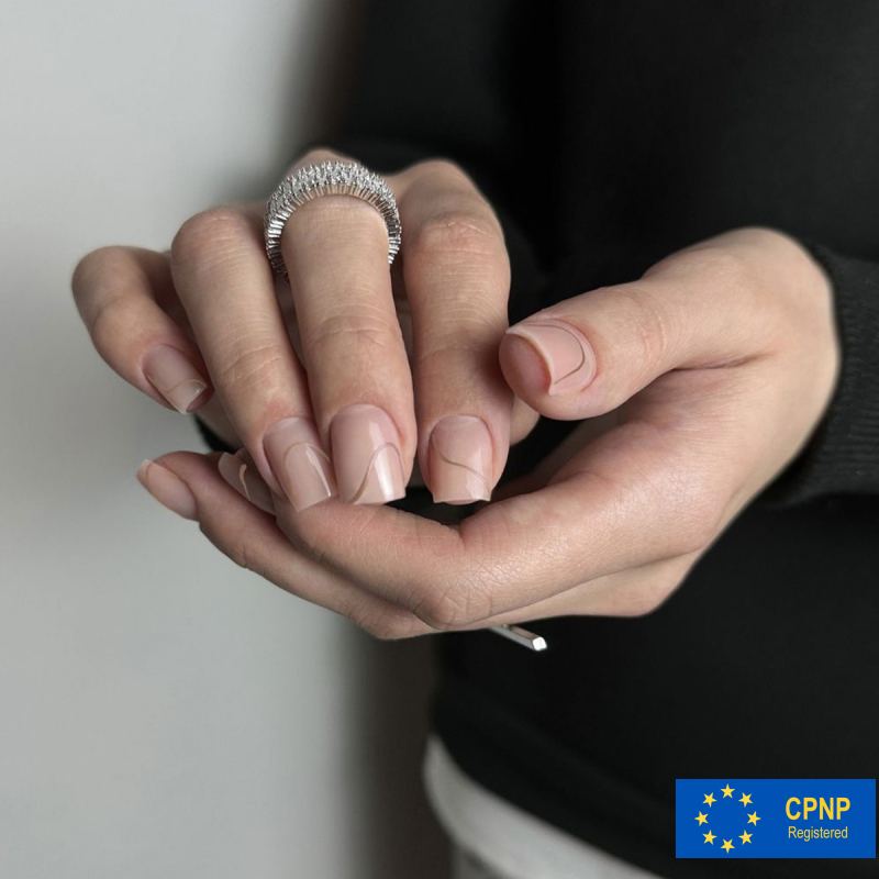 4. Applicera gel på nageln med hjälp av en pensel så att den täcker fria nagelkanten, men inte nuddar nagelbanden. Låt självutjämna i några sekunder, därefeter ta bort överbliven gele som kommer i kontakt med huden eller nagelbanden. Härda i UV/LED lampa i 60-120 sekunder.