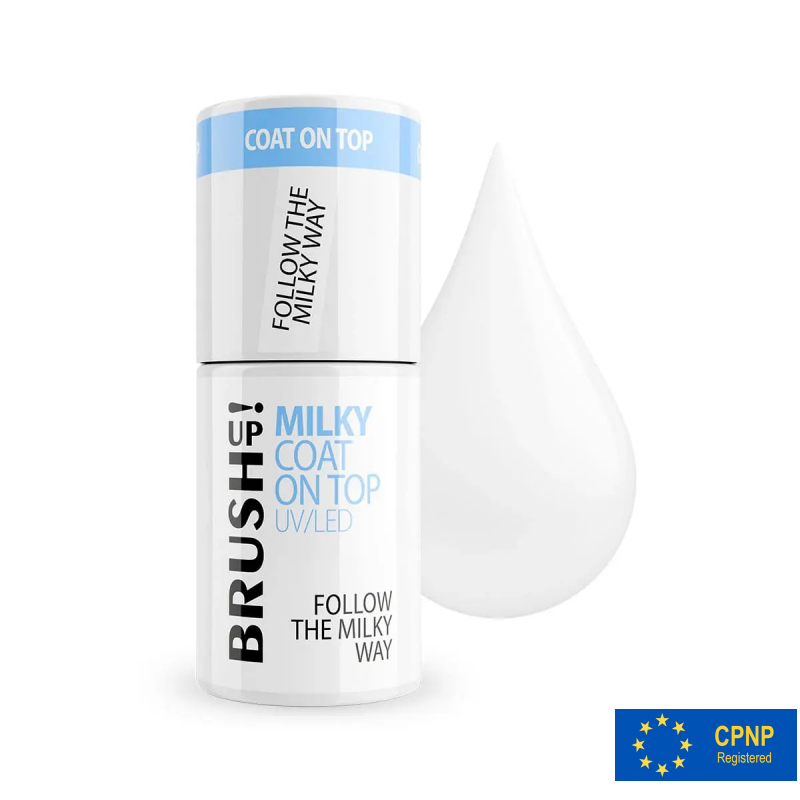 Follow The Milky Way Top Coat är ett mjölkvitt, halvtransparent topplack som appliceras som sista lager för att ge nageldesignen en mjölkig och glansig yta samt lång hållbarhet. NO WIPE toppen lämnar inget klibbigt dispersionslager, vilket eliminerar behovet av cleanser. Den är idealisk för nagelbyggnad med gel, gellack, akryl och polygel.