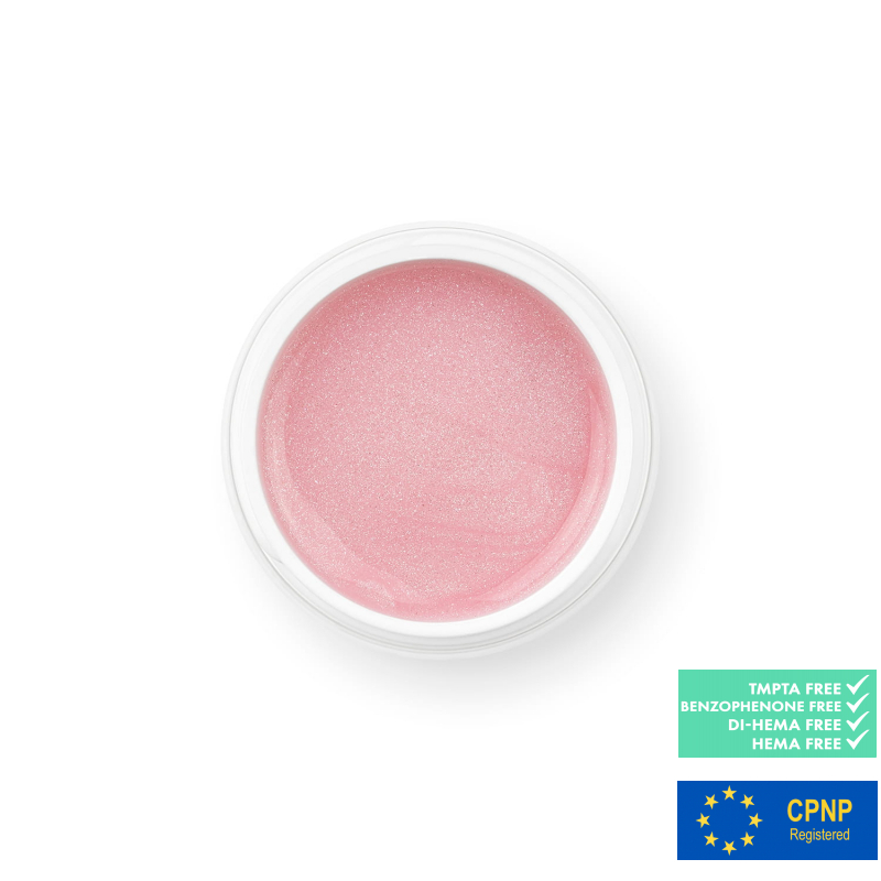 GLAM PINK – en delikat pastellrosa nyans med skimrande silverpartiklar. Perfekt att använda ensam för en full manikyr eller som bas för extra styling, med täckning upp till 90%.