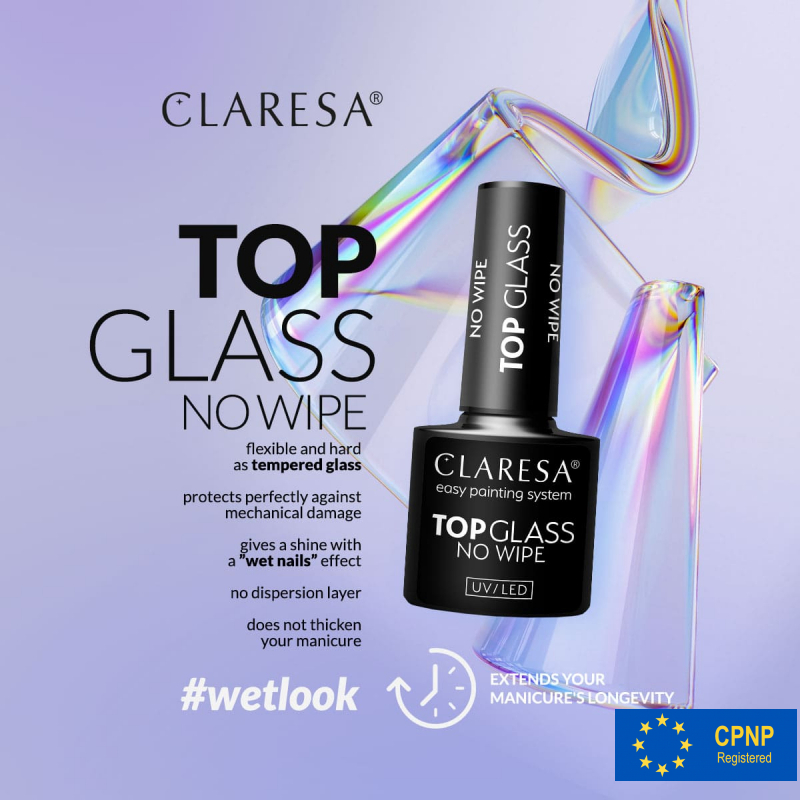 Glass Top Coat No Wipe används som det avslutande lagret för att skydda nageldesignen, förlänga hållbarheten och ge en glasliknande, “vått glas”-effekt. Den har dessutom en vacker specialeffekt som framträder under UV-ljus, där den lyser upp med en unik och iögonfallande glans. Top Coaten är utan klibbigt dispersionslager (NO WIPE), vilket innebär att ingen rengöring med cleanser behövs. Perfekt att använda tillsammans med gel, gellack, akryl och polygel.