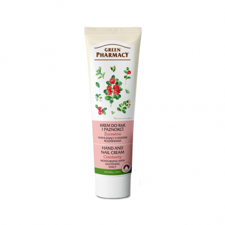 Fuktgivande hand- och nagelkräm från Green Pharmacy med ljusande effekt, med tranbär. Återfuktar, skyddar mot torrhet och irritation, ger näring. Det återställer jämnhet och mjukhet. Det lättar upp lätta missfärgningar. Naturligt tranbärsbärsextrakt med anti-aging effekt, neutraliserar fria radikaler och verkar antibakteriellt. Det växtbaserade multivitaminkomplexet stärker dessutom denna verkan. Allantoin hjälper till att bli av med skador på epidermis, och keratin tillsammans med B-vitaminer stärker nagelplattan från att vara tunn och spröd. Glycerin återfuktar och stramar upp huden.