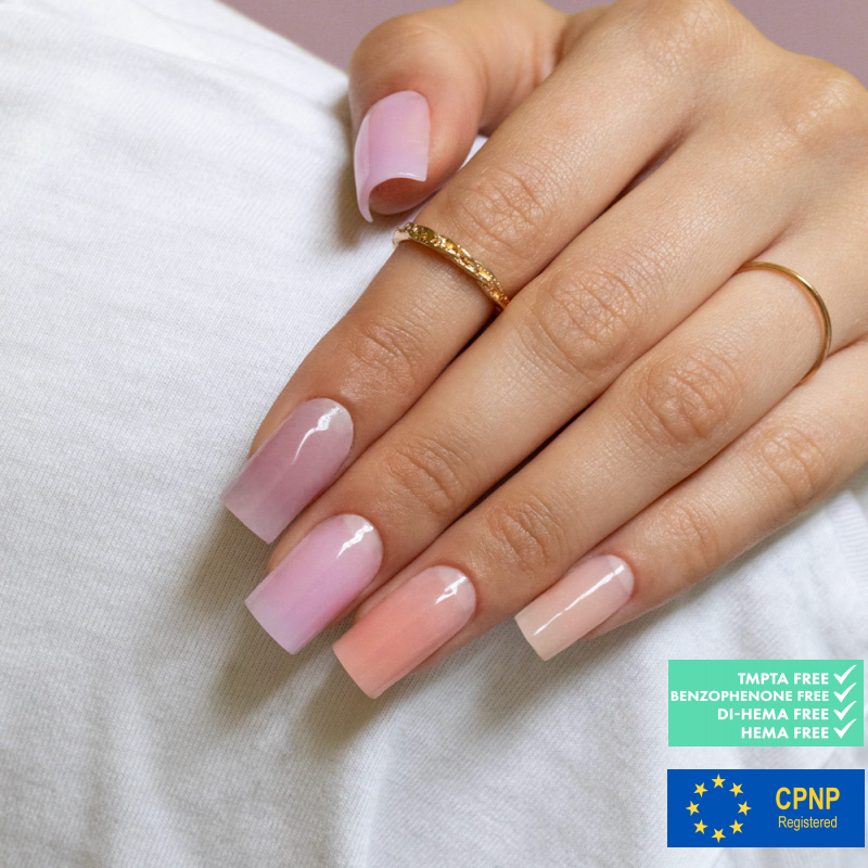 3. Applicera ett tunt lager med bas (base coat) så att det täcker den fria nagelkanten, men inte nuddar nagelbanden. Härda i UV/LED lampa i 60 sekunder. Var försiktig med att inte röra vid nagelytan förrän nästa steg.