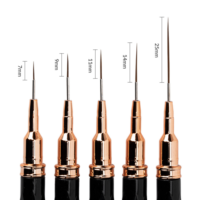 Ett set som innehåller 5 olika nagelpenslar / liners med lock, perfekta för att skapa detaljerade nageldesigner, mönster och linjer vid arbete med gele, gellack akryl samt nagelkonst.
