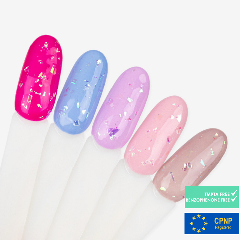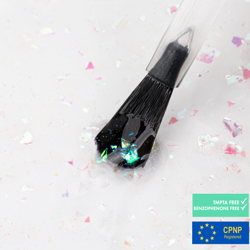 Drop Flakes Phantom: – oregelbundna partiklar som skimrar med rosa och grön-turkos glöd. Egenskaper - klar / transparent med effekt - No Wipe / utan klibbigt dispersionslager - hård - självutjämnande - genomsnittlig härdningstid: ca 60 sek. (beroende på lampa och lagertjocklek) - för professionellt bruk - tillverkad i EU - registrerad i EU:s kosmetikaregister CPNP - fri från TPO, Benzhophenone