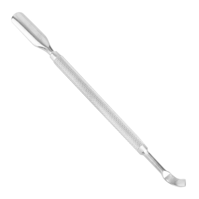 Dubbelsidig nagelbandspusher / spatel i rostfritt stål formad för att bekvämt följa formen hos nagelbanden. Ena spetsen är halvcirkelformad för att bekvämt följa samt flytta bort nagelbanden, den andra spetsen är skarpare för att rengöra nagelkanten. Professionell manikyr- och pedikyrverktyg för borttagning av nagelband, men även för modellering med gel och polygel.