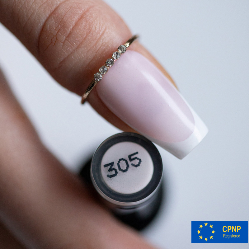 Delicate French nr. 305: en mjuk ljusrosa ton med ett naturligt och stilrent utseende. Skapar en tidlös och elegant känsla och är lika passande för fransk manikyr som för heltäckande applicering.