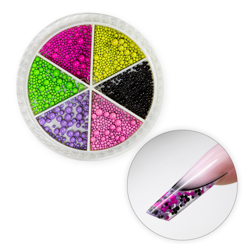 Rund ask med pärlor i olika färger och storlekar för användning som dekoration i nageldesign. Dekorationen limmas eller byggs in på en förberedd nagel och förseglas runt sina kanter med en klar finish gel, topplack eller annan klar nagellack. Dekorationer går utmärkt att använda med gelé, akryl och de flesta andra nagelsystem.