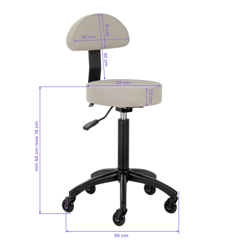 Höj och sänkbar hög arbetsstol med ryggstöd och hjul med polyuretanbeläggning som är perfekt till skönhetssalonger, kliniker och kontor. Sadelstolen är något högre i jämförelse med klassiska arbetspallar för maximal komfort vid arbete. Klädsel är tillverkad i grå-beige antibakteriellt konstläder av hög kvalitet som är lätt att rengöra.