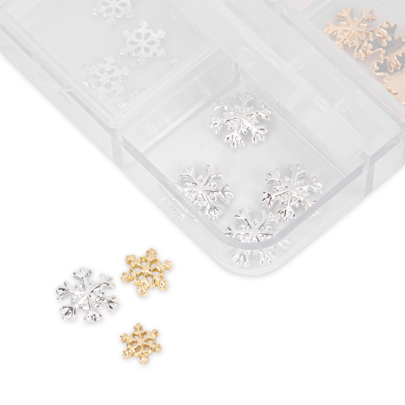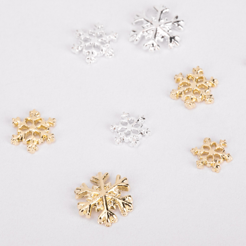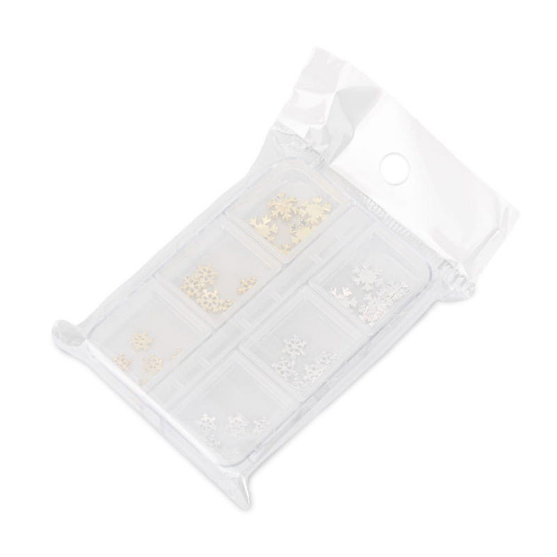 Fyrkantig ask med metalliska nageldekorationer i guld och silver, formade som snöflingor i totalt 6 (x5) olika designer. Dekorationerna fästs enkelt på en förberedd nagel och förseglas runt kanterna med klar finishgel, topplack eller annat transparent nagellack. Passar utmärkt för användning tillsammans med gelé, gellack, polygel och akrylsystem.
